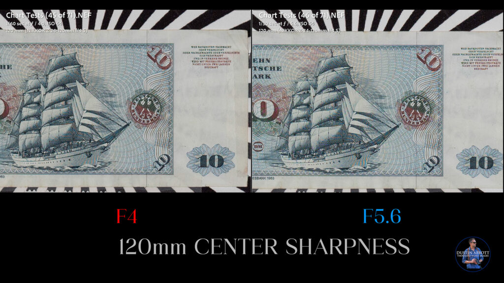 But 85mm actually represents the low ebb of sharpness for the lens, as, surprisingly, it is actually better at 120mm. It’s not just better at F4, but sharpens up to levels not reached at 50mm or 85mm in the center when stopped down to F5.6: