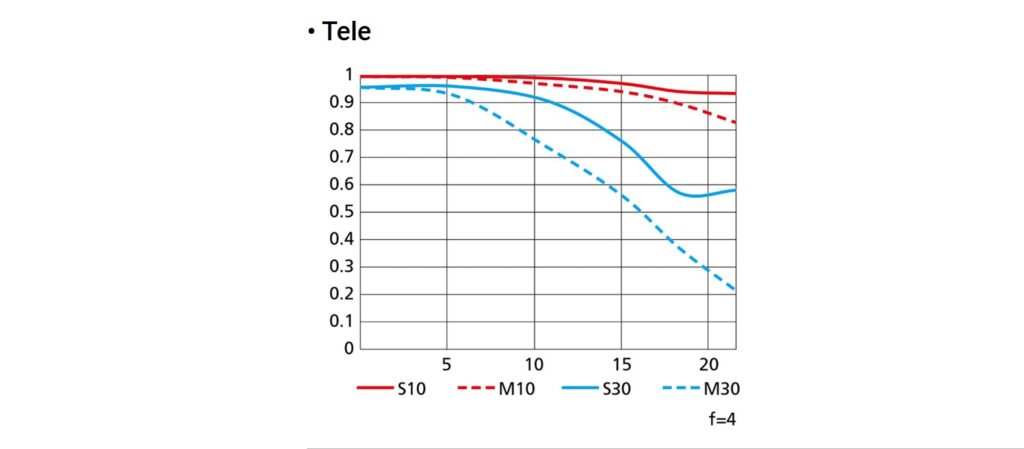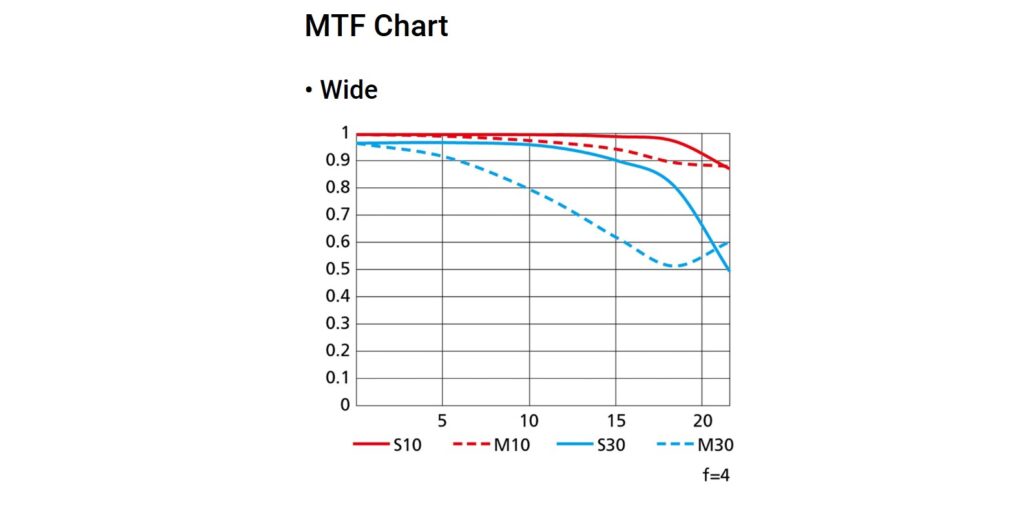 The MTF chart looks mostly excellent at 24mm, with exceptional center sharpness and amazing sharpness in the midframe on the sagittal plane, though the meridional plane (dotted line) drops a bit (expect less contrast there). There’s the typical dip into the corners, but not terrible. The 120mm result is a bit less consistent, as while the center also starts excellent, the dip out of peak sharpness starts earlier and goes much deeper in the corners.