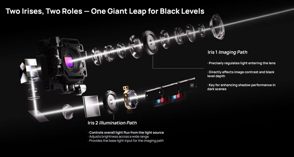 The headline feature is XGIMI’s Dual Intelligent Iris System—two separate irises working in tandem for unprecedented black-level performance. Iris 1 sits in the imaging path, directly controlling contrast and shadow depth. Iris 2 handles the illumination path, managing overall light flux and brightness.