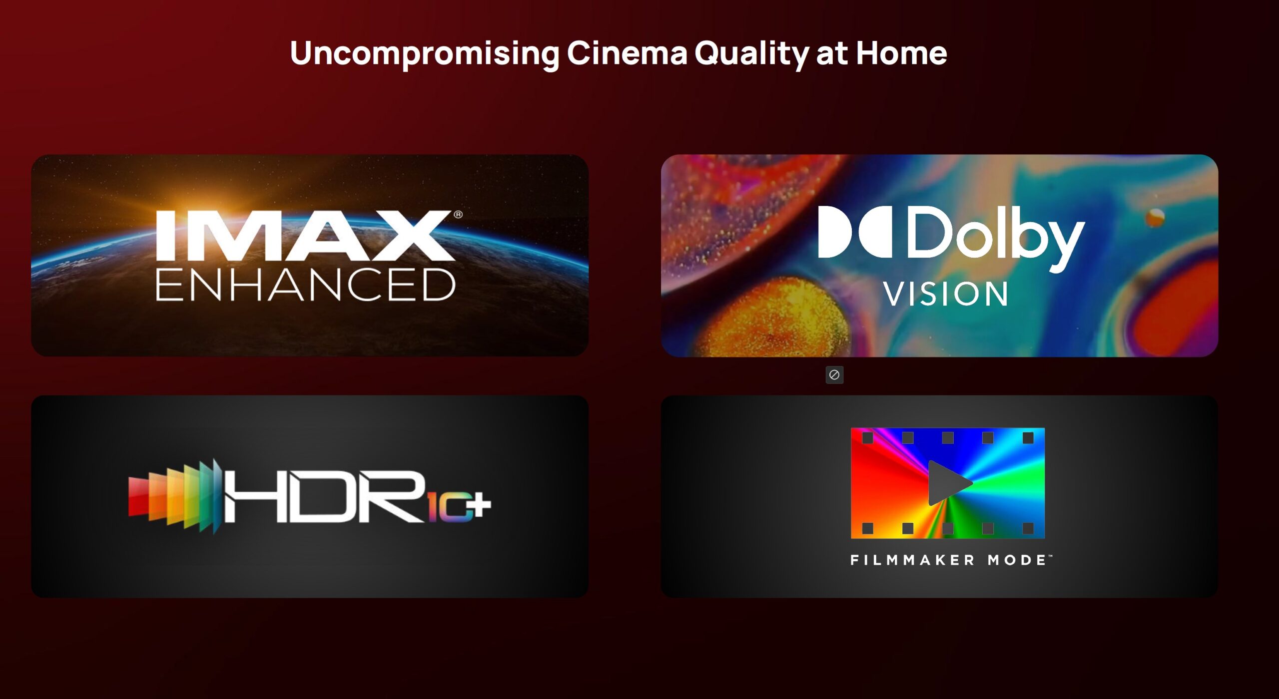 - IMAX certification (+26% area), Dolby Vision, HDR10+, Filmmaker mode (adjusts to original frame rate, aspect ratio, colors, and brightness)