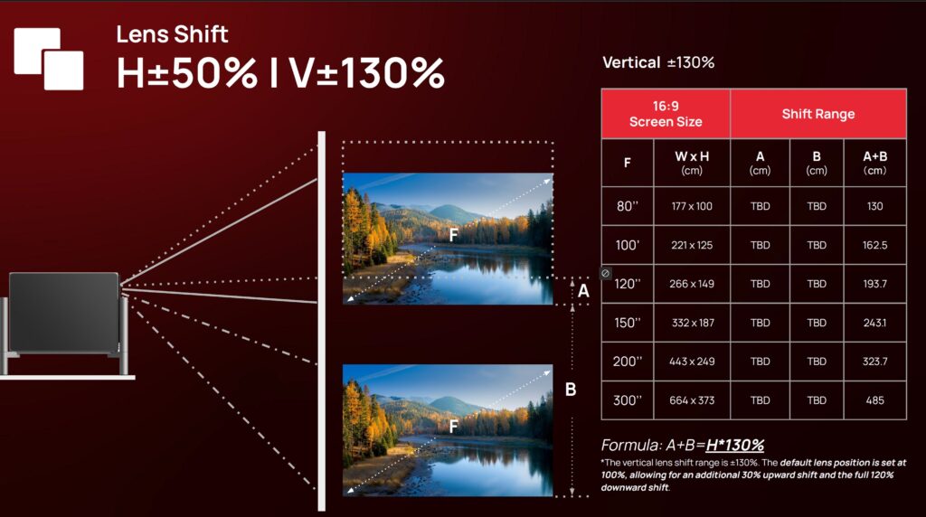 - Lens shift: Horizontal ±50%, Vertical ±130% (with lens memory for up to 5 positions—perfect for switching between 16:9 and 2.35:1 CinemaScope)