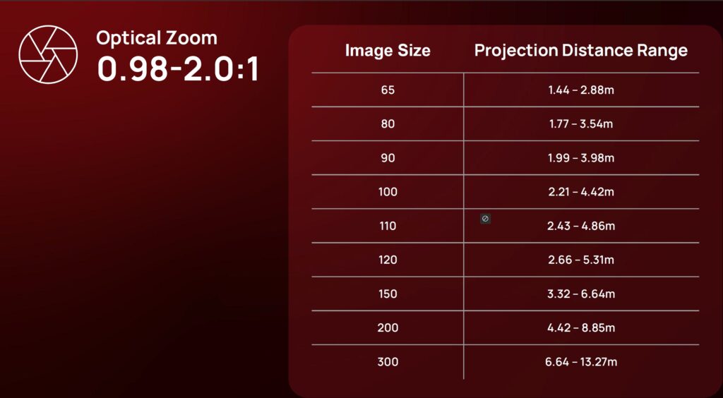 - Throw ratio: 0.98–2.0:1 (120″ screen from 2.66–5.31 m / 8.7–17.4 ft)