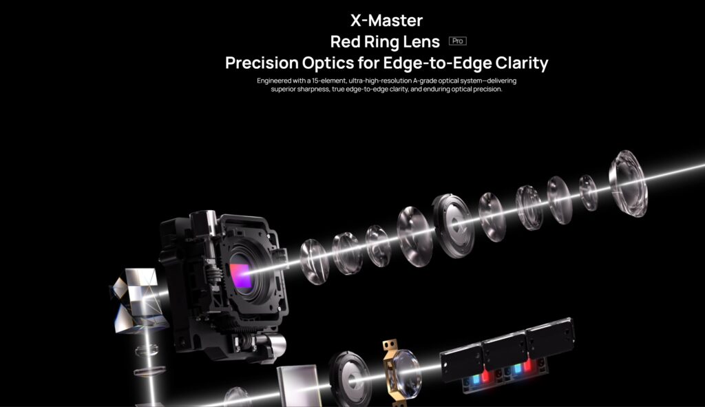 The X-Master Red Ring Lens Pro (exclusive to the Max) is a 15-element, ultra-high-resolution optical system with 99.6% light transmittance, 14-layer vacuum coating, and aspherical glass to suppress spherical aberration. Edge-to-edge sharpness is exceptional.